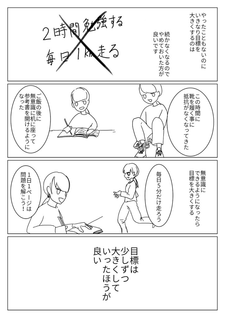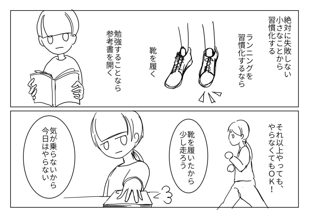 勉強すことを習慣化したいなら参考書を開く、ランニングを習慣化したいなら靴を履くという風に小さなことから始めること。